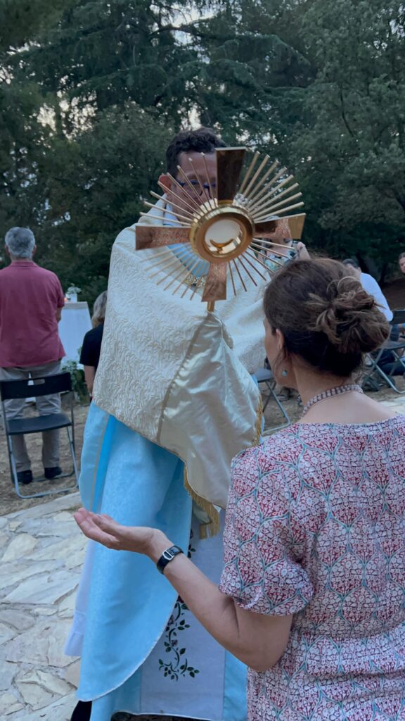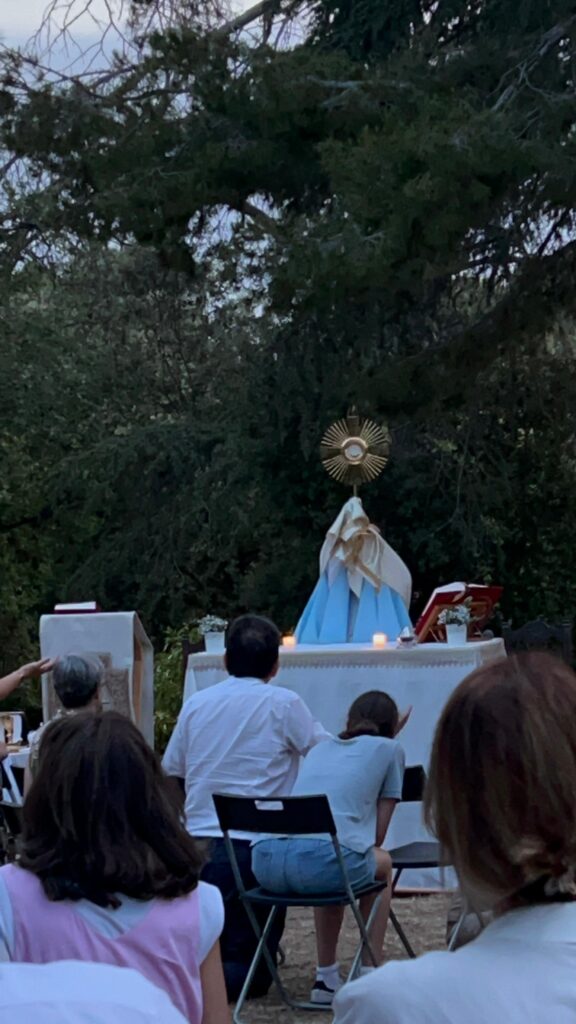 Comenzamos con el rezo del Santo Rosario, con la mirada puesta en la Reina de la Paz, y le pedimos especialmente por la situación actual de los países en guerra. A continuación, celebramos la Eucaristía, presidida por el P. Germán, y al finalizar renovamos la consagración al Corazón de María. Ya con el sol caído, tuvimos la gracia de adorar a Jesús en el Santísimo Sacramento del altar.