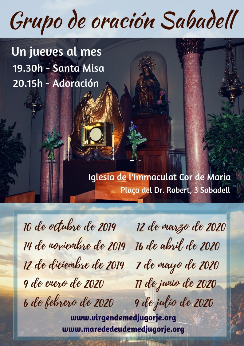 El jueves 10 de octubre reiniciará el grupo de oración María Reina de la Paz de Sabadell. Los encuentros serán un jueves al mes, quedando el calendario de la siguiente manera: