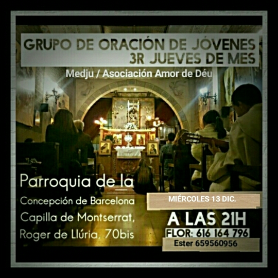 Una vez al mes los jóvenes adultos que han peregrinado a Medjugorje con la asociación Amor de Déu comparten una hora de oración frente al Santísimo. El grupo está dirigido por Mn. Salvador Juanola y está abierto a todos aquellos jóvenes adultos que hayan peregrinado a Medjugorje, lo vayan a hacer o sientan simpatía por la Virgen.