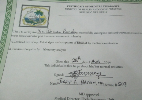 La mujer por la que Pajares se vino llorando a España, creyendo que la dejaba en manos de la muerte, hoy levanta los brazos al cielo y da gracias: «El Señor me ha rescatado del infierno, me ha dado otra oportunidad de estar entre los vivos. Es un milagro». Sí. Los que sobreviven al ébola bien atendidos en occidente rozan el 40%. En Liberia, el 10%, uno de cada 10. Y entre los elegidos, Paciencia, tal y como acredita el documento que le han dado en Elwa, y en el que se lee: «Este documento certifica que la hermana Paciencia Ronda ha superado con éxito los cuidados y tratamientos relacionados con el virus de la enfermedad (…) A. Declarada libre de cualquier signo clínico y síntomas de ébola, por examen médico. B. Confirmado negativo en análisis en laboratorio». El certificado está fechado el 25 de agosto y lo firma el doctor Jerry F. Brown, con el número de licencia 507.
