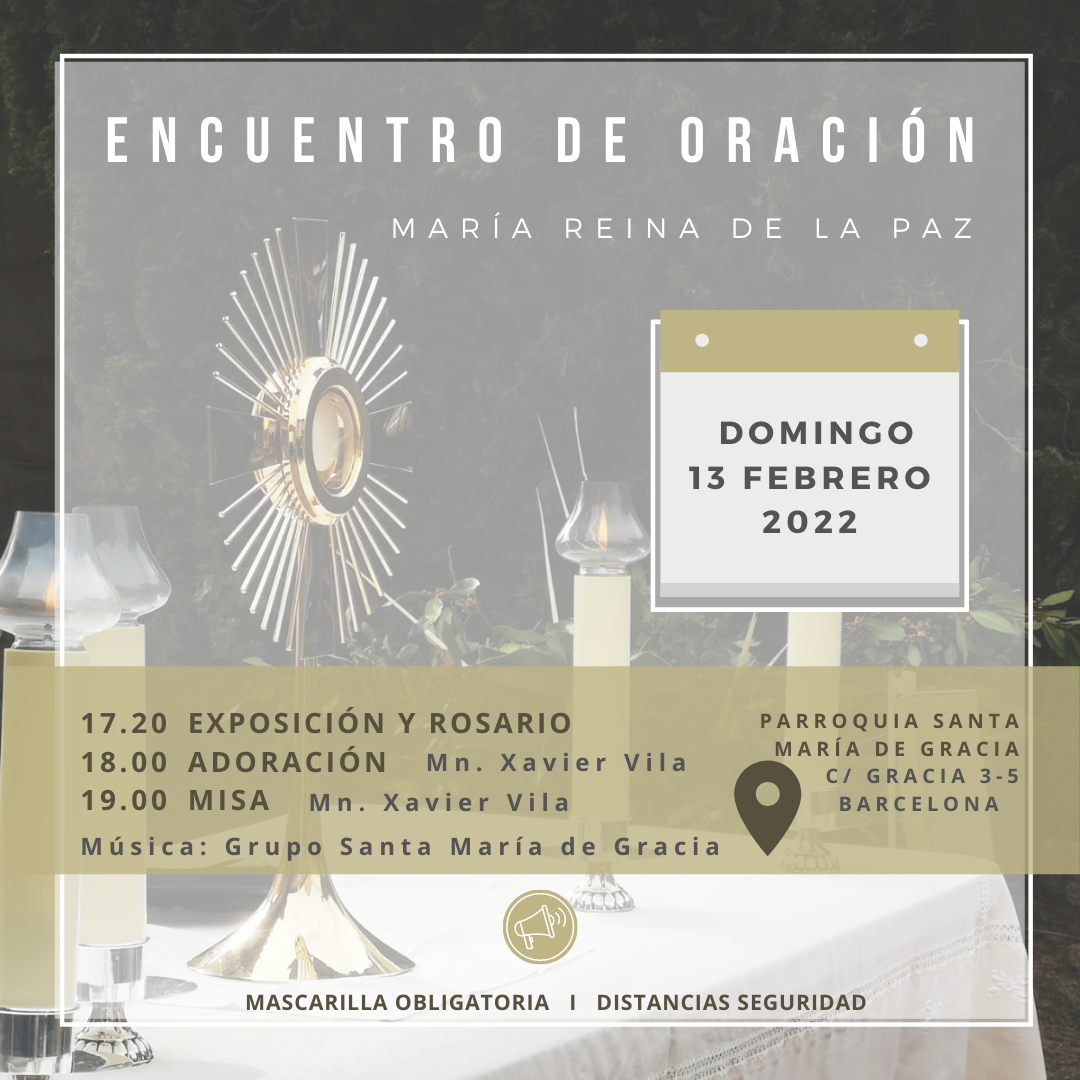 ¡Os esperamos en el encuentro de oración el domingo día 13 de febrero a las 17:20h en Santa María de Gracia! (C/ Gracia, 3-5, Barcelona)