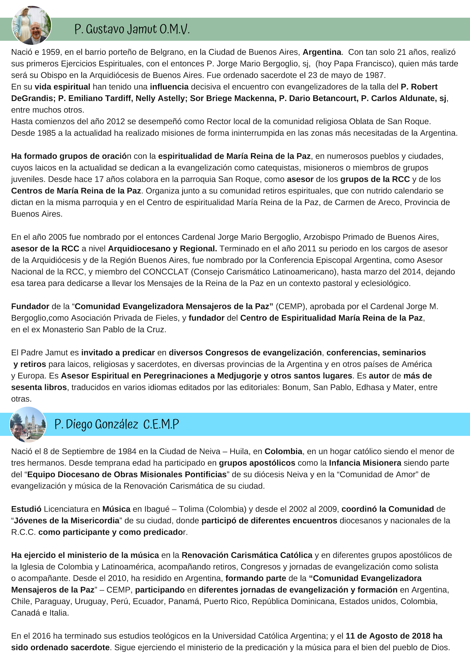 Ponentes en los principales Congresos Iberoamericanos de María Reina de la Paz, su misión es dar a conocer los mensajes de la Virgen por América y Europa. En esta ocasión, vienen directamente desde Medjugorje para impartir un Encuentro de Oración.