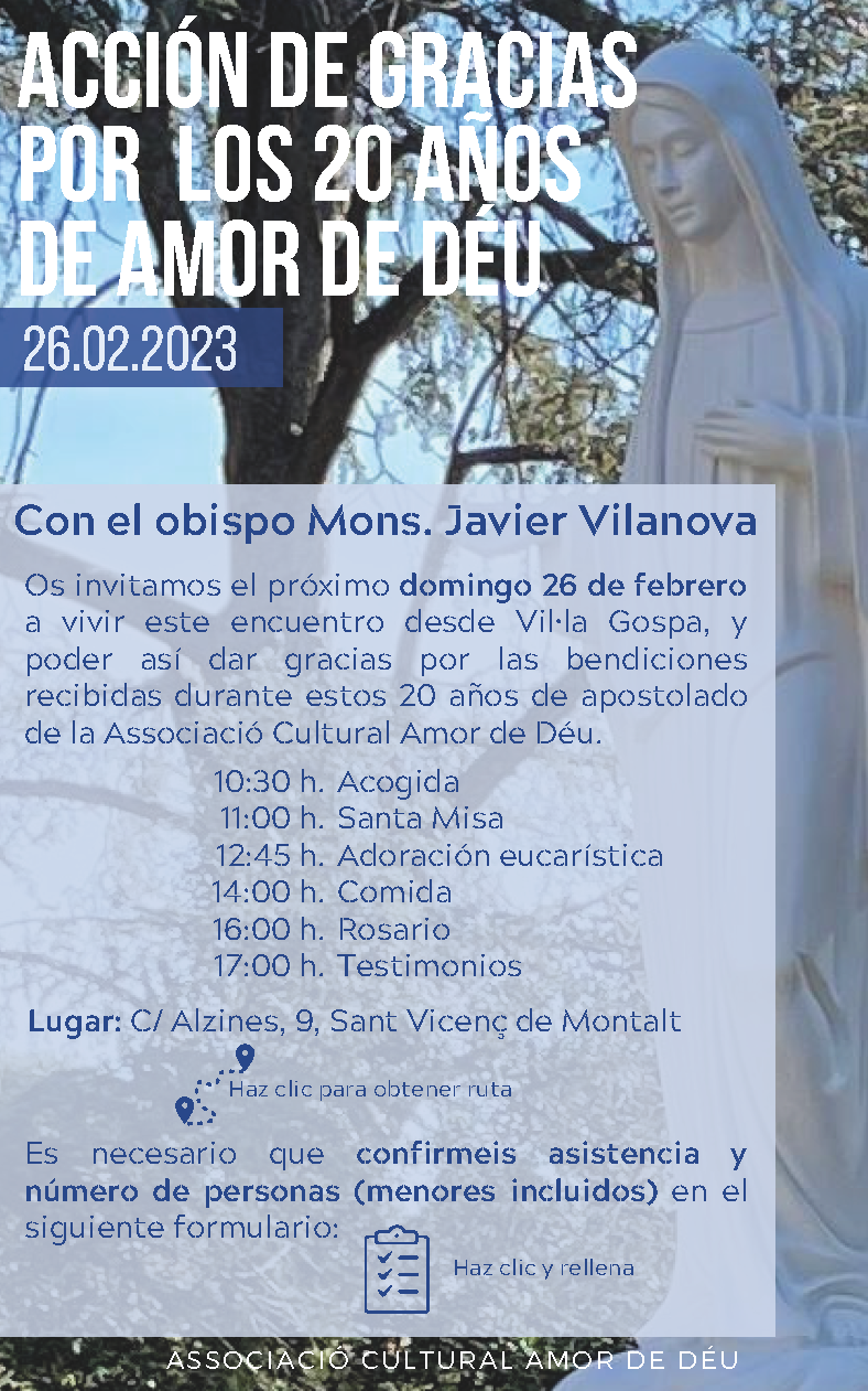 El domingo 26 de febrero , nos reuniremos en Vil·la Gospa para dar gracias a la Gospa de los 20 años de apostolado en la espiritualidad Reina de la Paz.