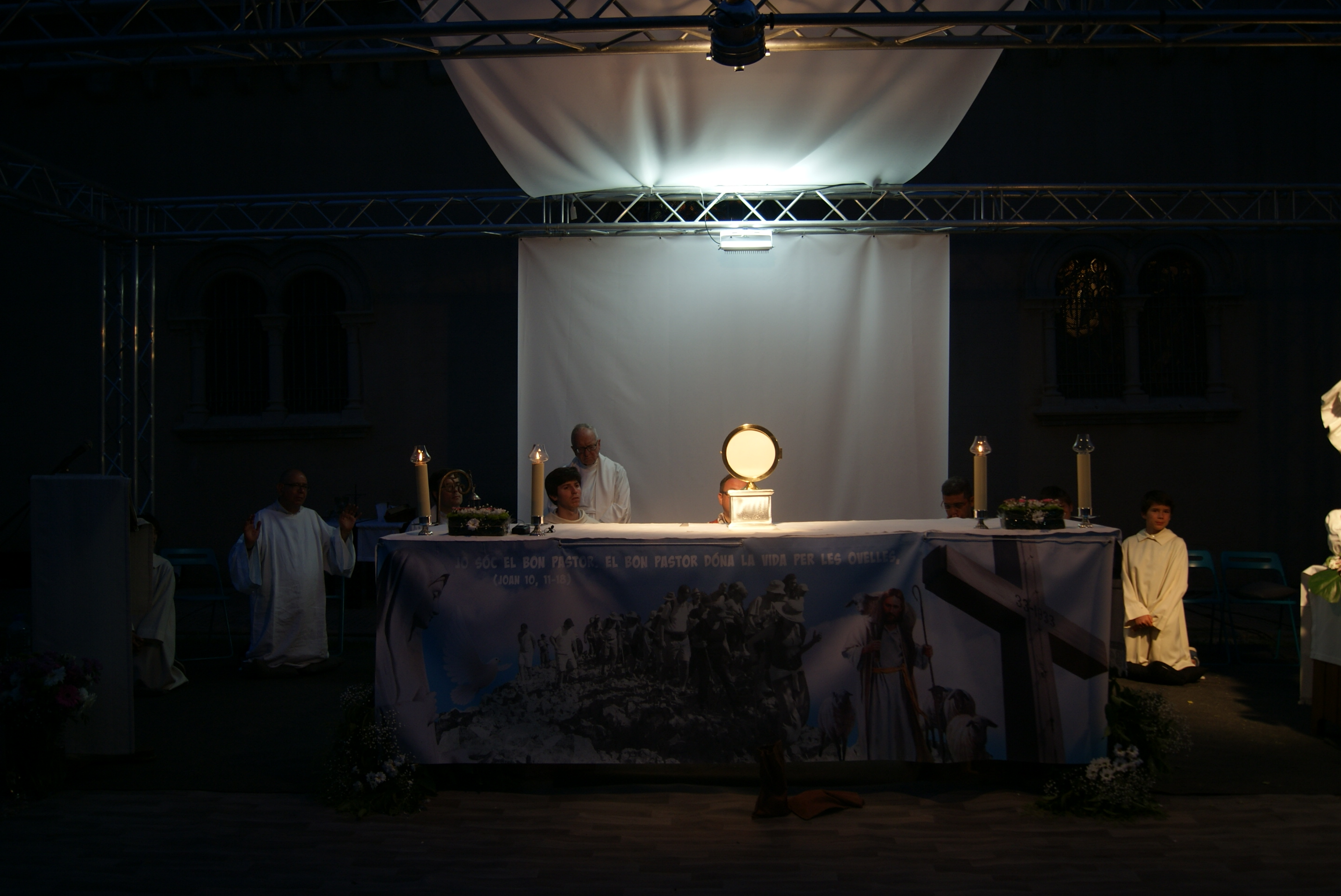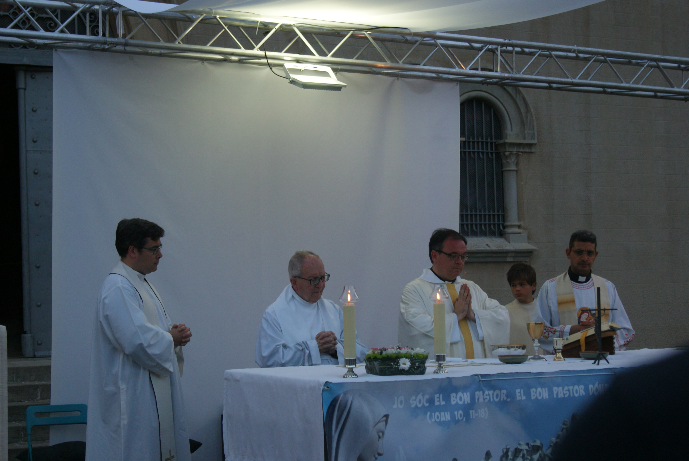 A las 20:30h comenzó la Santa Misa. Mn. Oriol Pallàs, quien además celebraba el decimosexto aniversario de su ordenación sacerdotal, la dirigió junto con el P. Andreu Guim, Mn. Marc Labori y Mn. Albert. También nos acompañaron varios seminaristas, entre los cuales se encontraba Pablo Pich-Aguilera Blasco, y monaguillos.