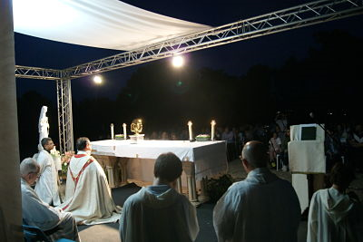De 21:15h a 22:30h pudimos revivir en la Adoración al Santísimo esa paz tan asombrosa que se siente en Medjugorje, aún estando la explanada llena de gente. Bajo el cielo anocheciendo, sólo un foco iluminaba al Santísimo y otro a la Gospa, envolviendo a todos los presentes de la intimidad necesaria para encontrarse con el Señor. El silencio de la adoración sólo se vio roto por las meditaciones del sacerdote y la música. Antes de finalizar la adoración, Mn. Oriol recorrió el pasillo central bendiciendo con el Santísimo a todos los asistentes.