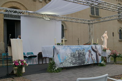 Desde bien temprano, varios voluntarios ya estuvieron montando la estructura de la carpa, colocando las sillas y encargándose de la iluminación y el sonido. Más tarde, otros colaboradores continuaron con la preparación litúrgica y musical. Un grupo de música compuesto por un pianista, una violinista, dos guitarristas y varias vocalistas hizo posible que la música y los cantos propios de Medjugorje nos acompañaran durante toda la celebración.