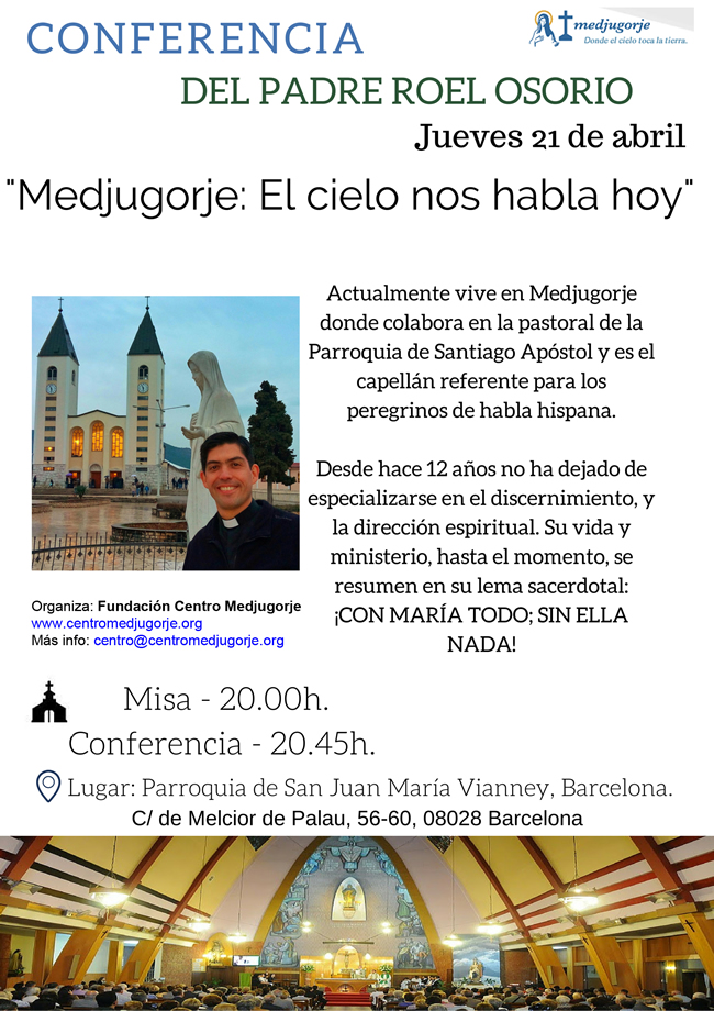 El P. Roel Osorio, L.C., ofrecerá una conferencia el próximo jueves día 21 de abril en la Parroquia de San Juan María Vianney de Barcelona. El P. Osorio vive actualmente en Medjugorje en donde colabora en la pastoral de la Parroquia de Santiago Apóstol donde desempeña la misión de capellán para los peregrinos de habla hispana.