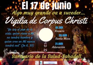El 17 de junio se celebrará en el Santuario de la Salut (Carretera de Caldes, km 24, 08202, Sabadell, Barcelona) la Vigilia de Corpus Christi.