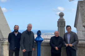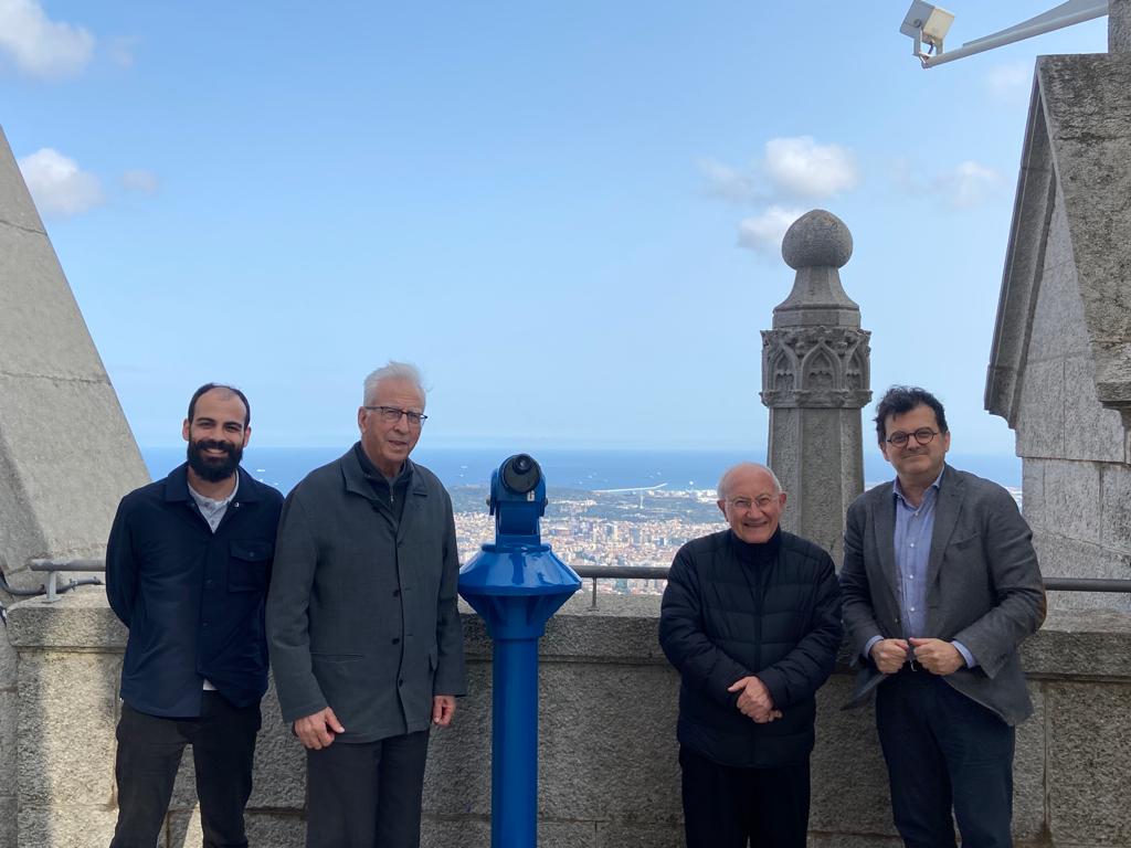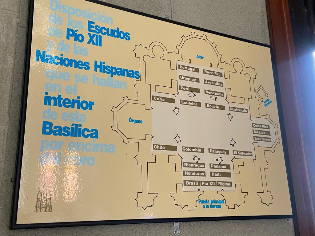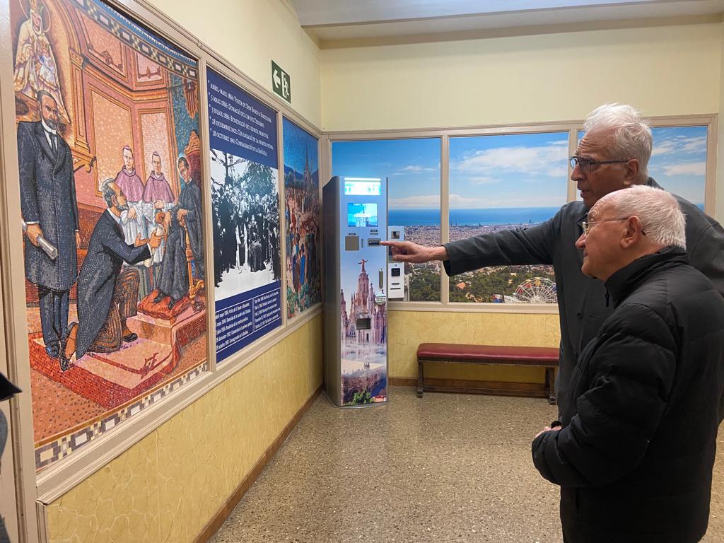 Fueron recibidos por el sacerdote salesiano Francesc Rius y junto a Oriol Vives, presidente de la Fundación Centro Medjugorje pudieron visitar el Templo Expiatorio del Sagrado Corazón, más conocido como el Tibidabo. El padre Francesc Rius les contó la historia de este bellísimo templo catalán, que fue construido en parte con los donativos de feligreses de Cataluña y de otras partes de España. También le mostró una ilustración que impresionó a Mons. Aldo, en la que aparecen representados los escudos de los países de Latinoamérica que alberga el templo, y que también contribuyeron con sus donativos, tal y como puede apreciarse en la fotografía.