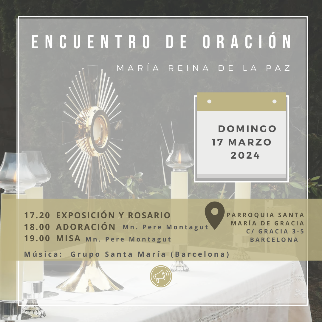 ¡Os esperamos en el encuentro de oración el domingo día 17 de marzo a las 17:20h en Santa María de Gracia! (C/ Gracia, 3-5, Barcelona)