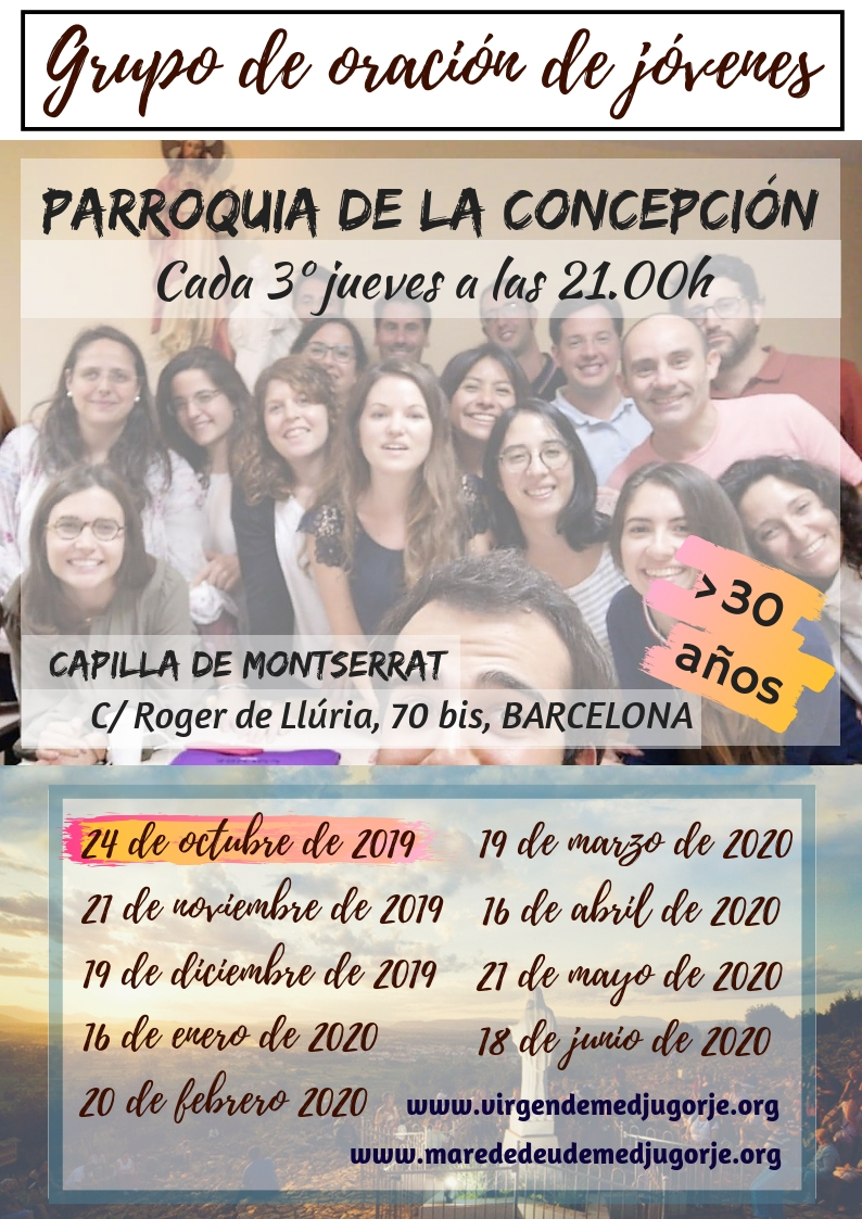 Una vez al mes los jóvenes adultos que han peregrinado a Medjugorje con la asociación Amor de Déu comparten una hora de oración frente al Santísimo. El grupo está dirigido por Mn. Salvador Juanola y está abierto a todos aquellos jóvenes adultos que hayan peregrinado a Medjugorje, lo vayan a hacer o sientan simpatía por la Virgen.
