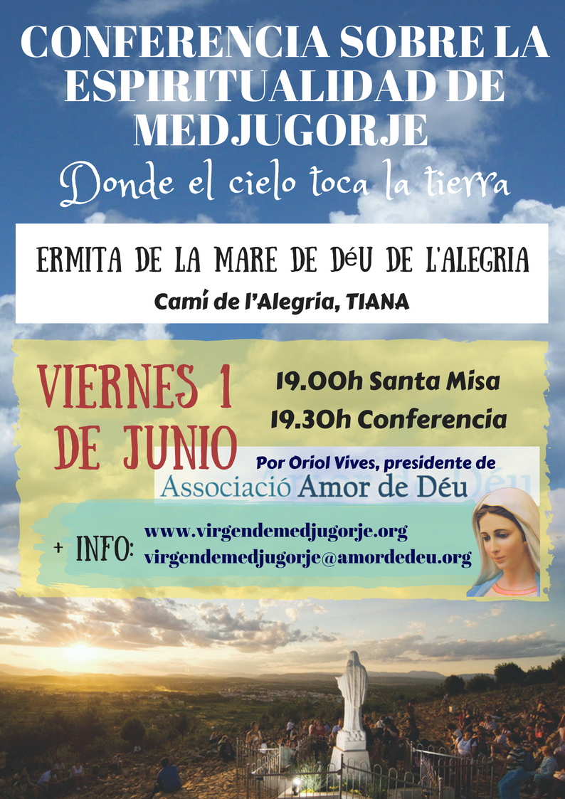 El día 1 de junio, viernes, a las 19:30h. – después de la Eucaristía (19:00h.) – tendrá lugar una conferencia, en la Ermita de la Alegría de Tiana, para todos aquellos interesados en conocer un poco más sobre la espiritualidad de Medjugorje. Será pronunciada por Oriol Vives, presidente de la Asociación Amor de Déu y de la Fundación Centro Medjugorje.