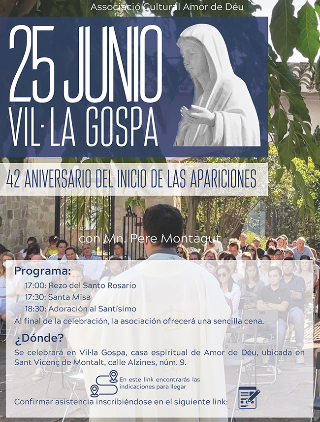 El próximo domingo 25 de junio se celebrará en Vil·la Gospa el 42 Aniversario del inicio de las apariciones. Os podéis inscribir clicando en la imagen.