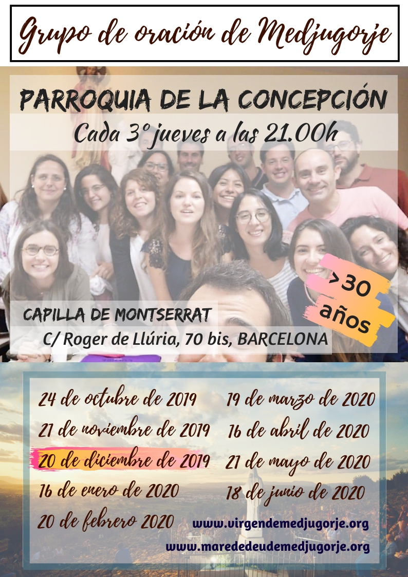Una vez al mes los jóvenes adultos que han peregrinado a Medjugorje con la asociación Amor de Déu comparten una hora de oración frente al Santísimo. El grupo está dirigido por Mn. Salvador Juanola y está abierto a todos aquellos jóvenes adultos que hayan peregrinado a Medjugorje, lo vayan a hacer o sientan simpatía por la Virgen.