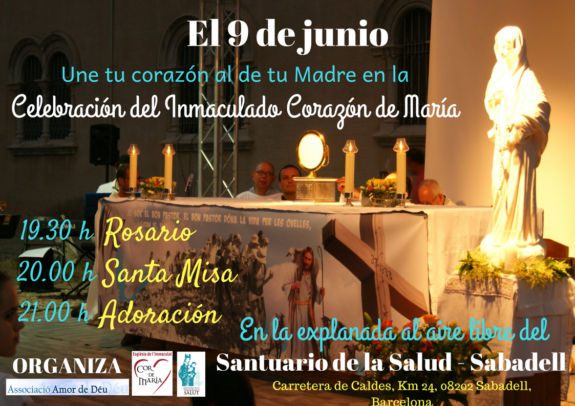 desde la Asociación Amor de Déu, que busca difundir y dar a conocer los mensajes de María en Medjugorje, se ha preparado para el sábado 9 de junio una celebración del Inmaculado Corazón de María organizada de forma conjunta con la Iglesia del Inmaculado Corazón de María y el Santuario de la Salud de Sabadell.