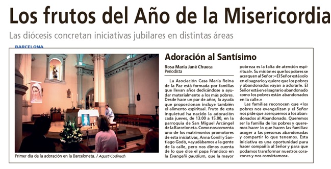 La Asociación Casa María Reina de la Paz (www.casademariareinadelapaz.org ) está formada por familias que llevan años dedicándose a ayudar materialmente a los más pobres. Desde hace un par de años, la ayuda que proporcionan incluye también el elemento espiritual. Fruto de esta inquietud ha nacido la adoración cada jueves, de 13:00 a 15:00, en la parroquia de San Miguel Arcángel de la Barceloneta. Como nos comenta uno de los matrimonios promotores de esta iniciativa, Anna Conill y Santiago Godó, “ayudábamos a la gente de la calle, pero nos dimos cuenta de lo que dice el papa Francisco en la Evangelii gaudium, que la mayor pobreza es la falta de atención espiritual”. Su misión es que los pobres se acerquen al Señor: “El Señor está solo en el sagrario y quiere que los pobres y abandonados vayan a adorarle. El Señor está en el sagrario abandonado como los pobres están abandonados en la calle”.