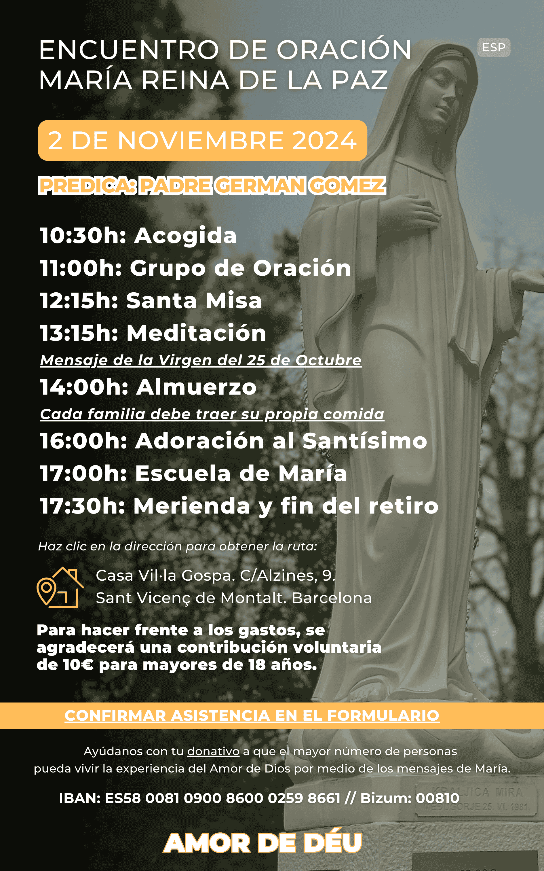 La Asociación Cultural Amor de Déu organiza un retiro el sábado día 2 de noviembre de 2024 en Vil·la Gospa, a 35 minutos de Barcelona. Este retiro de un día lo dirigirá el P. Germán Gómez.