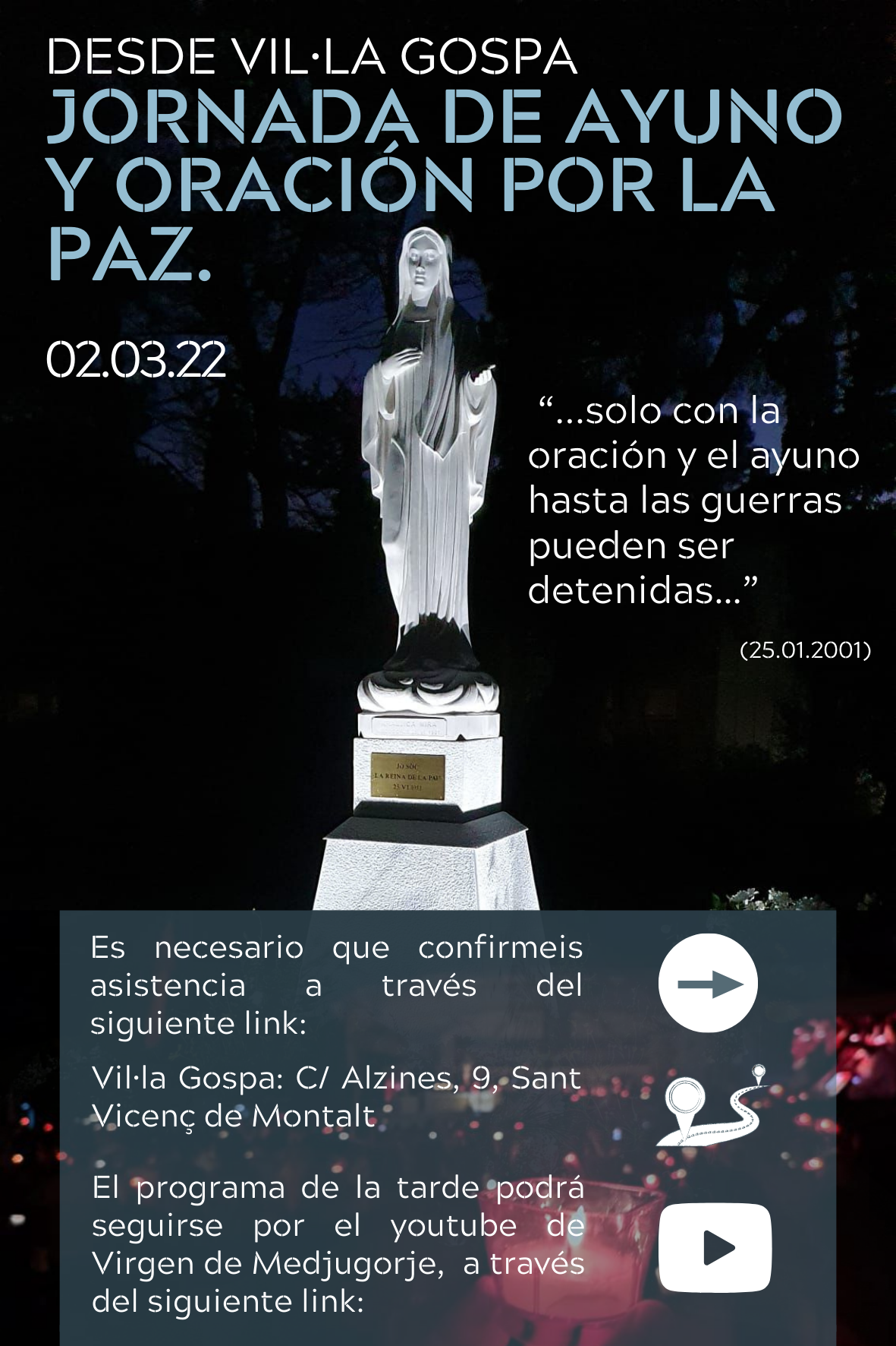 Este 2 de marzo, miércoles de ceniza y Jornada de Oración por los que no conocen el amor de Dios, y siguiendo el llamamiento del Papa Francisco a una Jornada de ayuno por la paz, os invitamos a Villa Gospa de 12h. a 22h.