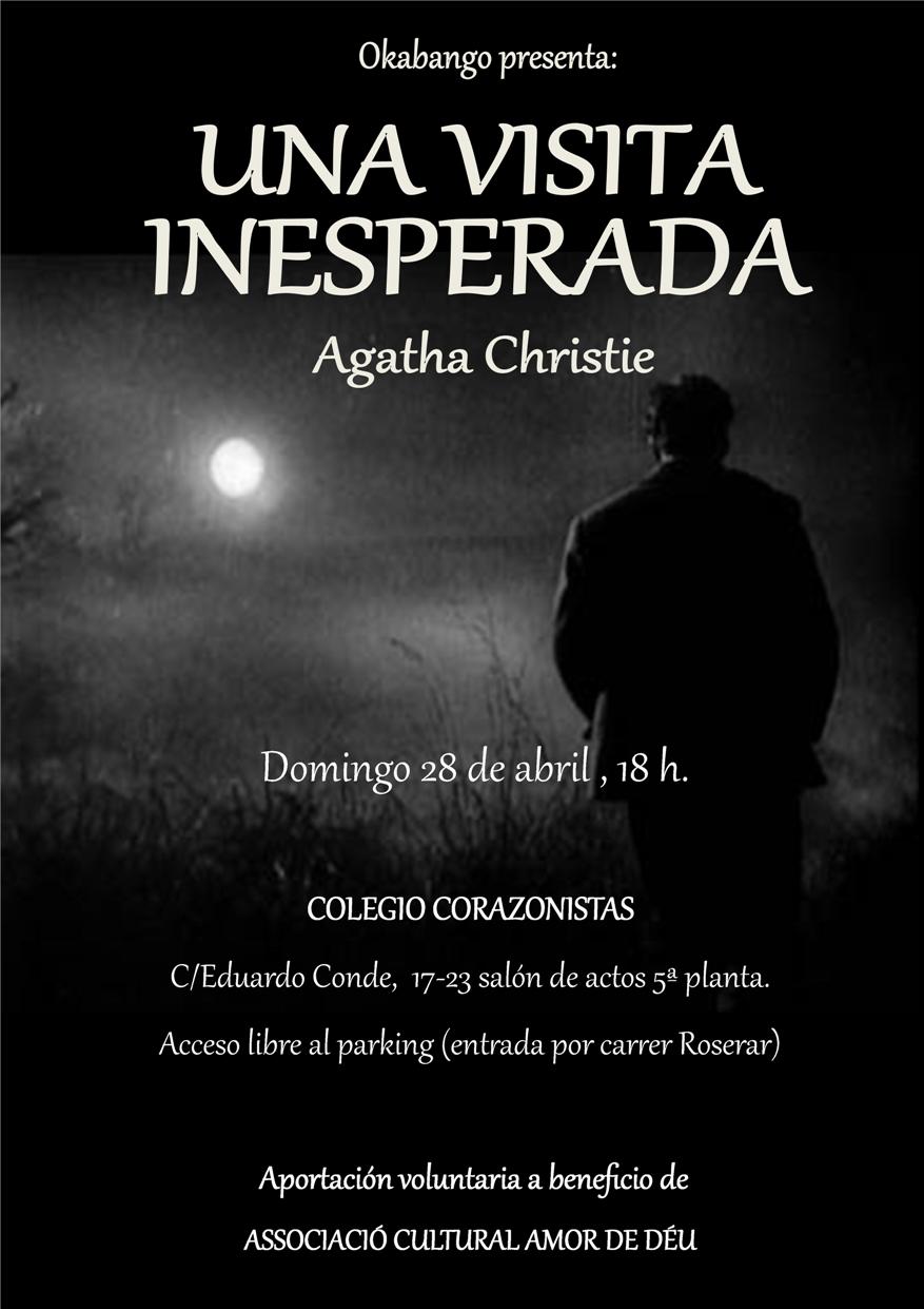 El domingo 28 de abril, el grupo de teatro Okabango, representará en Barcelona una obra de intriga de Agatha Christie, titulada “Una visita inesperada”. La finalidad de esta iniciativa es recaudar fondos para la Asociación cultural Amor de Déu, la cual como todos sabéis, se dedica principalmente a difundir las apariciones de la Reina de la Paz en Medjugorje.