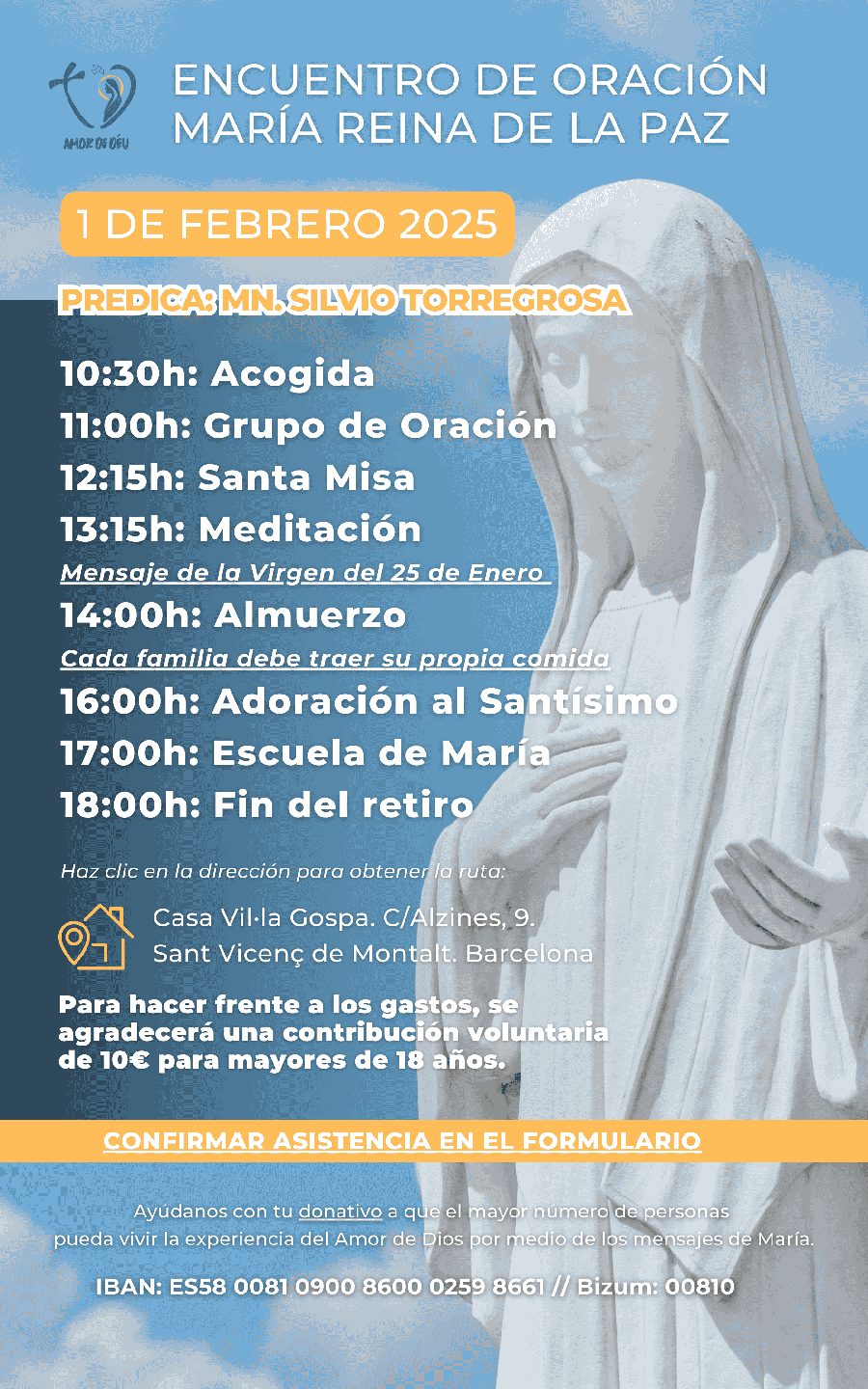 La Asociación Cultural Amor de Déu organiza un retiro el sábado día 1 de febrero de 2025 en Vil·la Gospa, a 35 minutos de Barcelona. Este retiro de un día lo dirigirá Mn. Silvio Torregrosa.