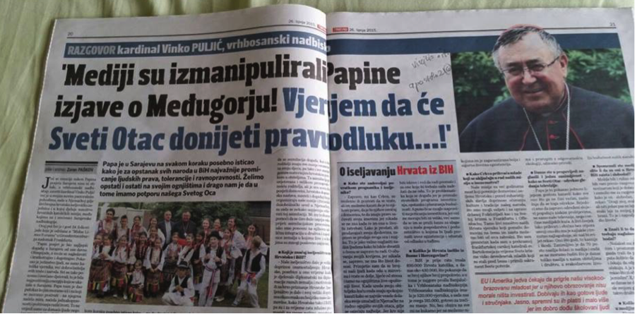 Lamento mucho que los medios de comunicación le hayan dado mayor importancia a ello, y también de manera errada, a algunas declaraciones del Papa sobre Medjugorje, en comparación con sus mensajes mucho más sobresalientes relacionados con otros problemas de Bosnia y Herzegovina. Para decirlo mejor: ellos han distorsionado y manipulado algunas de sus declaraciones sobre Medjugorje, sobre las apariciones de la Virgen y sobre otras cosas relacionadas a ellas. El Papa, sin embargo, sólo ha querido decir, de alguna manera, que hay algunos “videntes”, que no pueden hacer, de eso que viven, de sus experiencias, un show mediático con la Virgen, y anunciar cómo es y a qué hora ella se manifestará. Y por lo tanto, es inaceptable interpretar eso como una declaración final del Papa. Algo que algunos medios de comunicación rápidamente ya han hecho. Obviamente, con el deseo de destruir las buenas relaciones existentes entre los fieles que aceptan Medjugorje y que por años se dirigen en peregrinación allí. Y el mismo Papa, creo, tomará sobre Medjugorje una decisión correcta y buena. Sinceramente, tengo que decirles que estoy vinculado a Medjugorje y pertenecía a la Comisión que examinó todo el caso de las apariciones. Entregamos nuestras conclusiones y las presentamos a la Congregación para la Doctrina de la Fe, que debe ahora trabajarlas y presentarlas al Santo Padre. Cuando la gente me pregunta lo que pienso de todo esto, yo digo: “orar no es un pecado, la Confesión no es un pecado, esto es lo más importante”.»