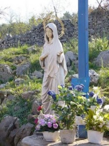La estatua de la Virgen María al lado de la nueva Cruz Azul que se puso para acomodar mejor a la multitud. El 18 de Mayo, la primera aparición pública del vidente Ivan Dragicevic fue seguida por miles de personas. El retorno de Ivan de USA significa más apariciones públicas en Medjugorje, y se señala como punto de ventaja para el aniversario en Junio.