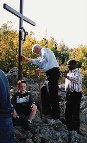 A la mañana siguiente nuestro grupo fue llevado al pie de la Colina de las Apariciones para ver a Vicka, una de las videntes, para oírle hablar sobre Nuestra Señora y sus mensajes. Esa tarde me confesé, cosa que desde hacia tiempo notaba que necesitaba. Durante la cena nuestro guía nos avisó de que si el tiempo era bueno subiríamos al monte Podbrdo el viernes. Cuando llegó ese dia, el tiempo era bueno, así que tomamos un taxi hasta al pie de la Colina de las Apariciones. Cómo conseguí subir la colina, no lo sé, pero cuando al fin llegué a la cima casi no podía tenerme en pie, y peor, sentía una gran dificultad para respirar. Decir que estaba hecho un desastre sería minimizar mi condición en gran manera, como muchos que estaban cerca de mi podrían testificar, incluyendo miembros de mi propia peregrinación.