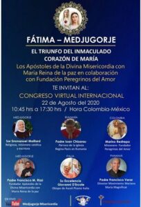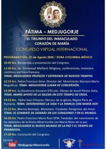 PS 2. El próximo sábado 22 de agosto se realizará un Congreso Virtual Internacional Fátima-Medjugorje – El triunfo del Inmaculado Corazón de María con la participación de diferentes conferencistas entre los cuales, Sor Emmanuel. A continuación, les indicamos los horarios de las diferentes charlas (horario de Colombia/México; adaptar los horarios según los distintos países)