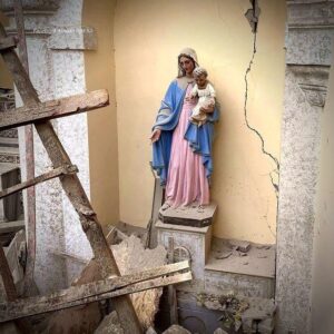 3. María nos dice: “Estoy con ustedes”. Si el hombre, inspirado por Satanás, destruye, María nuestra Madre, no se deja vencer; Ella nos acompaña y nos deja signos de su presencia maternal. Entre los escombros del terremoto en Siria, su estatua se mantiene intacta. Ver: