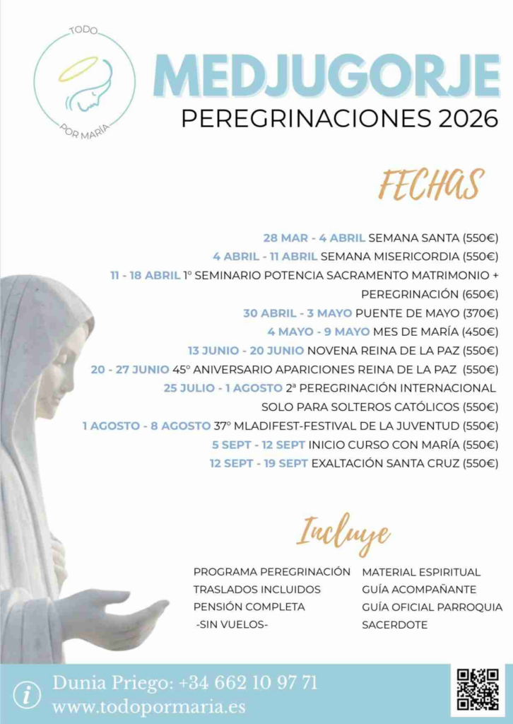 PS 5. El retiro para sacerdotes tendrá lugar del 29 de junio al 3 de julio bajo el tema ¡Ad fontem! (A la fuente). El retiro para los organizadores de peregrinaciones, responsables de Centros de Paz, grupos de oración y obras caritativas conectadas con Medjugorje, se realizará del 9 al 13 de marzo 2026.