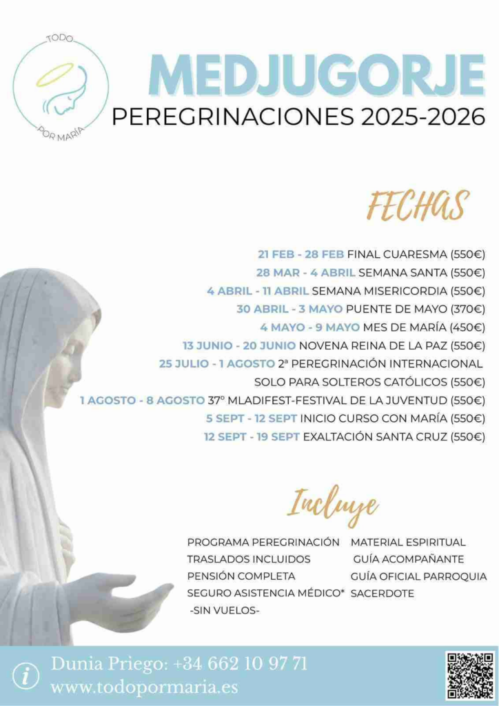 PS 5. El retiro para sacerdotes tendrá lugar del 29 de junio al 3 de julio bajo el tema ¡Ad fontem! (A la fuente). El retiro para los organizadores de peregrinaciones, responsables de Centros de Paz, grupos de oración y obras caritativas conectadas con Medjugorje, se realizará del 9 al 13 de marzo 2026.