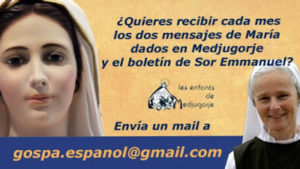 PS 4. Algunas perlas de la misión de Sor Emmanuel en España: Muchísima gente concurrió a las charlas en las diferentes ciudades y cerca de mil personas se han anotado para recibir el boletín. Muchas al hacerlo nos pedían oración. Sepan que todas las noches en nuestra casa de Bethleem en Medjugorje se reza por las intenciones de todos los Hijos de María, por lo que ya están todos incluidos.