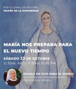 PS 1. El próximo sábado 23 de octubre a las 12:30 (hora argentina), 17:30 (hora europea), Sor Emmanuel dará una charla en directo sobre: “María nos prepara para el Tiempo Nuevo” por el canal de YouTube: María, Madre de la Humanidad. Hablará en inglés y será traducida simultáneamente al español. No se la pierdan.