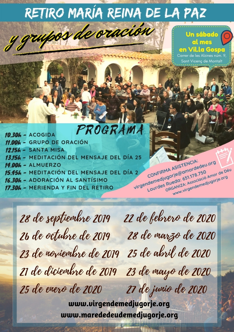 El sábado 28 de septiembre la Asociación Cultural Amor de Déu reinicia los retiros de María Reina de la Paz en Vil.la Gospa, una casa de espiritualidad a 35 minutos de Barcelona.