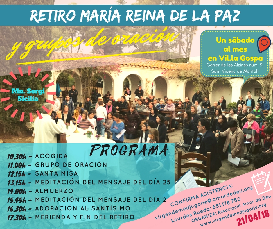 La Asociación Cultural Amor de Déu organiza un retiro el próximo sábado día 21 de abril de 2018 en Vil.la Gospa, a 35 minutos de Barcelona. Este retiro de un día lo dirigirá Mn. Sergi Sicilia.