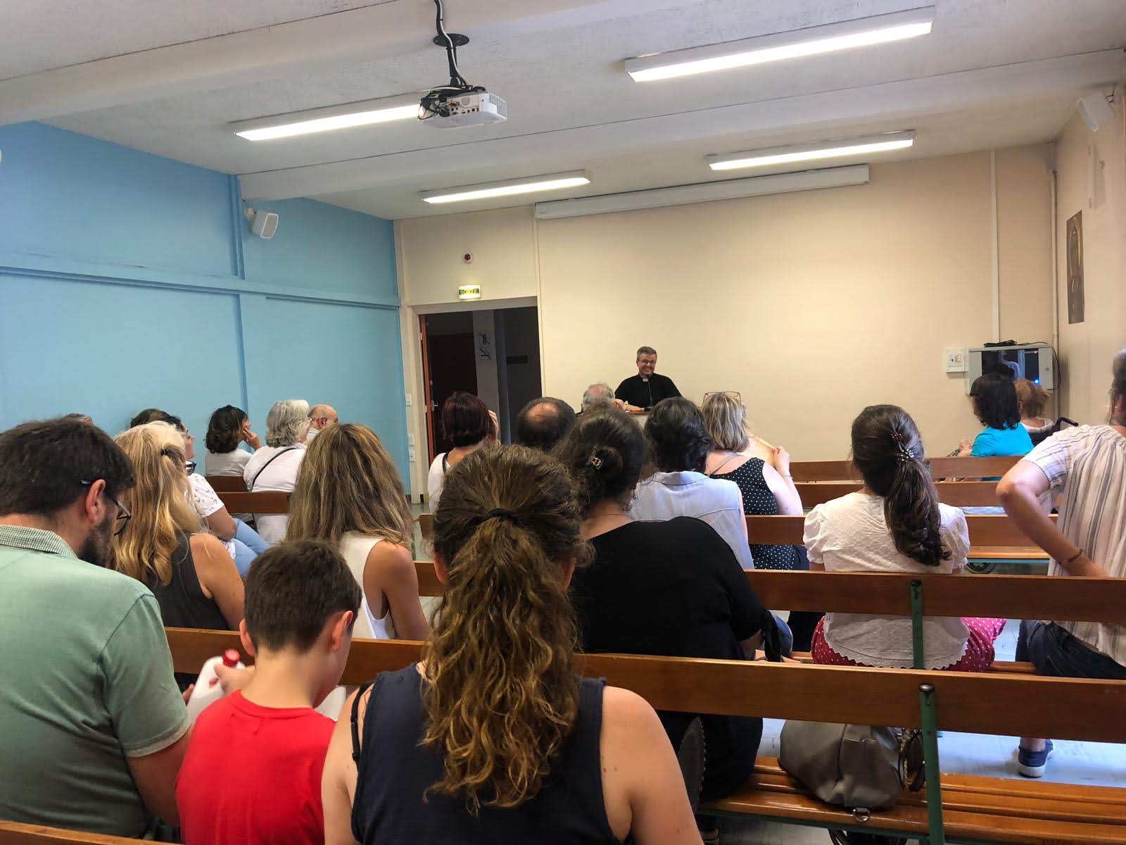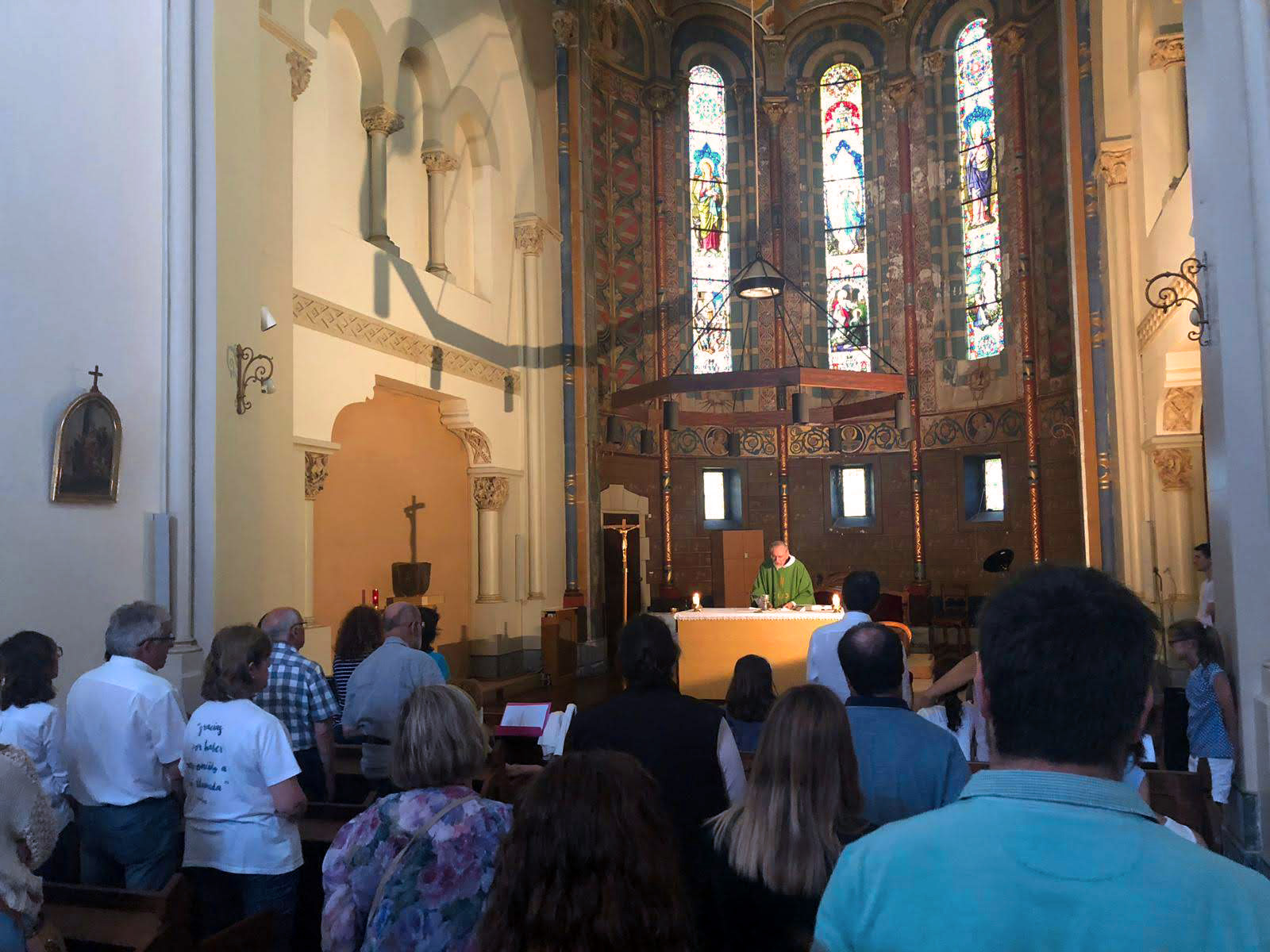 El P. Josep Maria Jané nos acompañó en este retiro para dirigir la parte de las actividades programadas desde la asociación. Así, el viernes, a la llegada de los peregrinos a Lourdes, presidió la Adoración al Santísimo en la iglesia de la residencia donde nos alojábamos. A la mañana siguiente, el grupo asistió a la primera meditación de los mensajes de la Virgen, la cual estuvo relacionada con los ejercicios espirituales de San Ignacio de Loyola. Tras finalizar la meditación, tuvo lugar la Santa Misa.