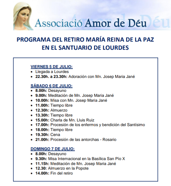 La Associació Amor de Déu celebró del 5 al 7 de julio el I Retiro María Reina de la Paz en el Santuario de Lourdes. Unas 50 personas disfrutamos de un fin de semana que combinó el habitual programa medjugoriano de los retiros mensuales en Vil.la Gospa con las celebraciones del Santuario. Este fue el programa: