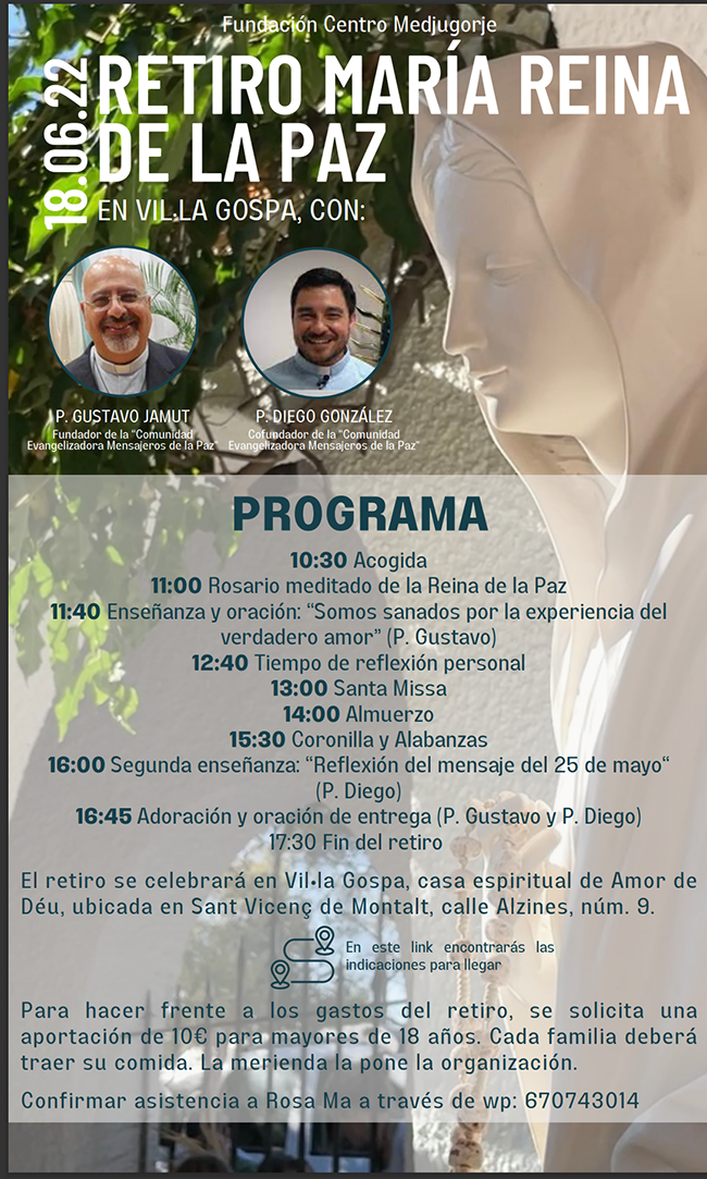 La Fundación Centro Medjugorje se complace en anunciar la visita de los Padres Gustavo Jamut y Diego González, venidos desde Argentina, para predicarnos un retiro, el sábado 18 de junio, en Villa Gospa, por gentileza de la Asociación Amor de Déu en el que podremos compartir una jornada de oración, formación y confraternization en el ambiente de esta casa que la Reina de la Paz tiene a tan solo unos minutos de Barcelona.