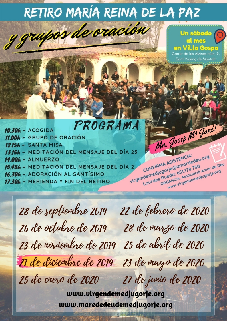 La Asociación Cultural Amor de Déu organiza un retiro el sábado día 21 de diciembre de 2019 en Vil·la Gospa, a 35 minutos de Barcelona. Este retiro de un día lo dirigirá Mn. Josep Mª Jané.