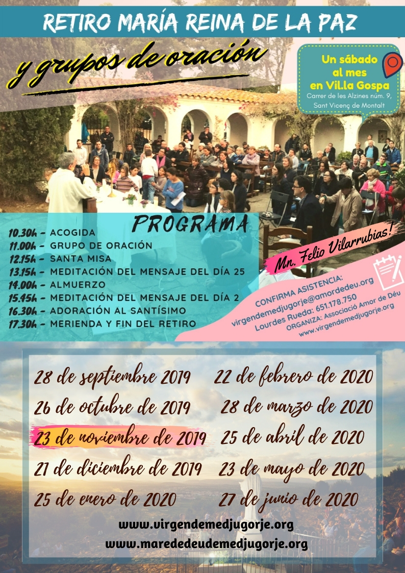 La Asociación Cultural Amor de Déu organiza un retiro el sábado día 23 de noviembre de 2019 en Vil·la Gospa, a 35 minutos de Barcelona. Este retiro de un día lo dirigirá Mn. Felio Vilarrubias.