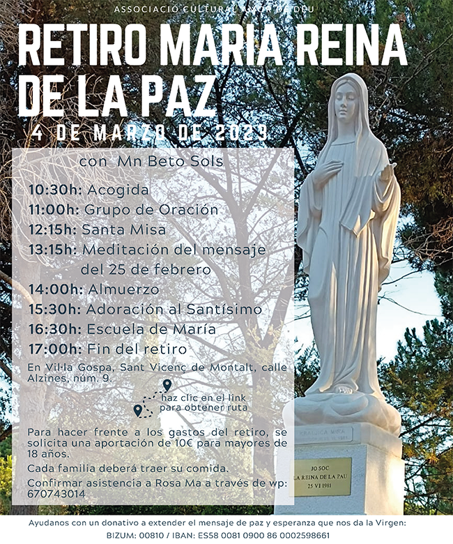 La Asociación Cultural Amor de Déu organiza un retiro el sábado día 4 de marzo de 2023 en Vil·la Gospa, a 35 minutos de Barcelona. Este retiro de un día lo dirigirá Mn. Beto Sols.
