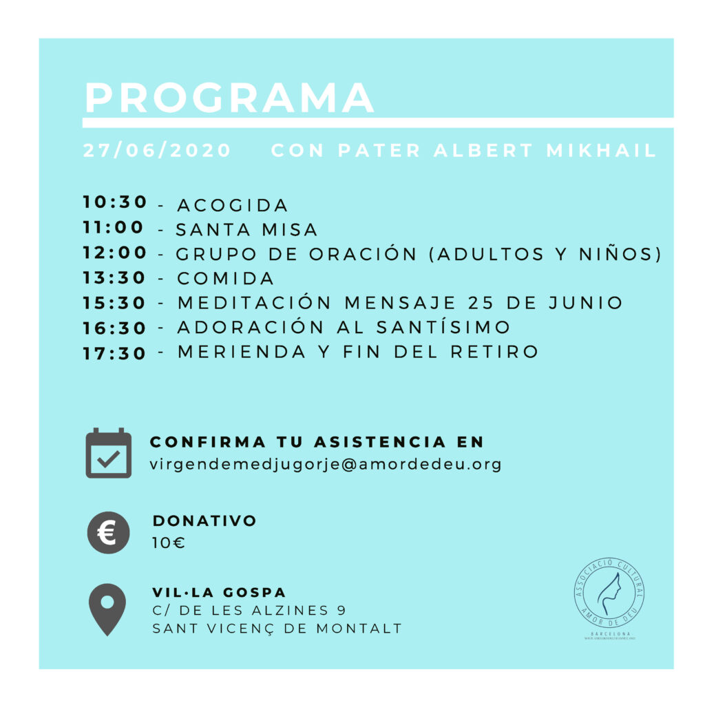 Desde la Asociación Cultural Amor de Déu volvemos a organizar un retiro este sábado día 27 de junio de 2020 en Vil·la Gospa. Después de llevar unos meses sin poderlo realizar es para nosotros una satisfacción poder reiniciar los encuentros en Vil.la Gospa. Por supuesto se van a tomar todas las medidas sanitarias que corresponden para que el retiro se realice con seguridad para todos (gel hidroalcohólico, distancia seguridad…) Rogamos que los asistentes lleven mascarilla. El retiro lo dirigirá Mn. Albert Mikhail.