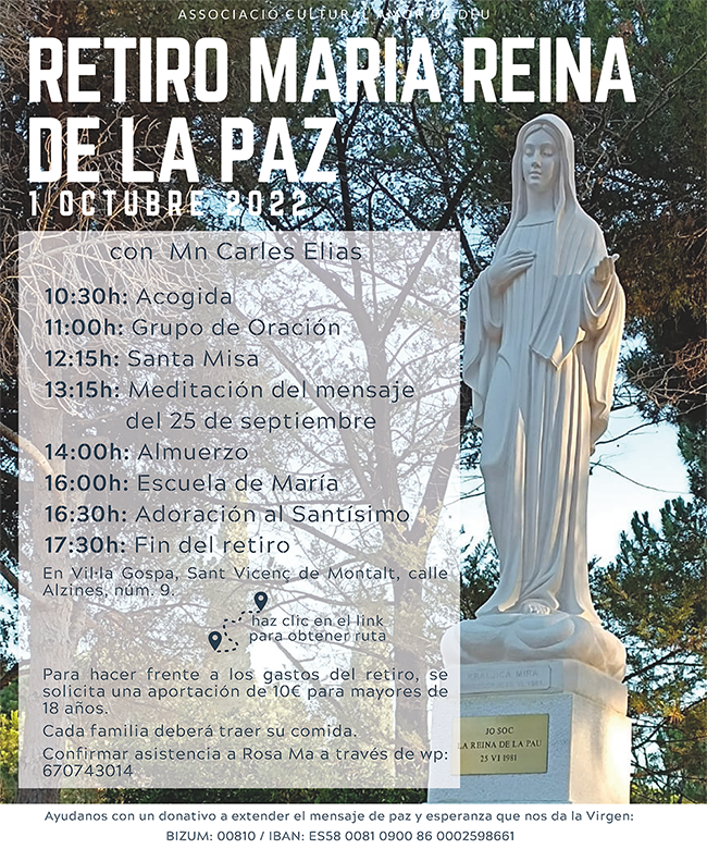La Asociación Cultural Amor de Déu organiza un retiro el sábado día 1 de octubre de 2022 en Vil·la Gospa, a 35 minutos de Barcelona. Este retiro de un día lo dirigirá Mn. Carles Elias.