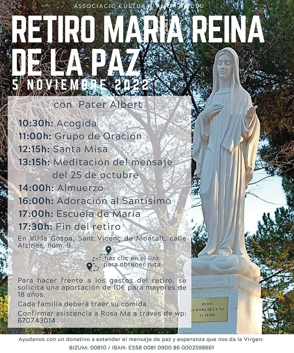 La Asociación Cultural Amor de Déu organiza un retiro el sábado día 5 de noviembre de 2022 en Vil·la Gospa, a 35 minutos de Barcelona. Este retiro de un día lo dirigirá Mn. Albert Mikhail.